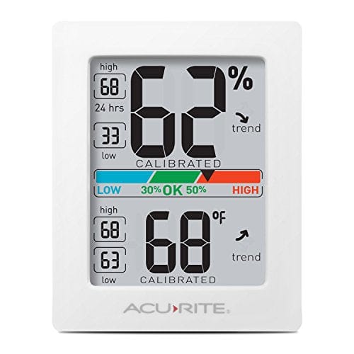 Details: Master your humidity levels with the AcuRite Pro Indoor Hygrometer and Thermometer. This small humidity gauge is ready for cigars, guitars, or whatever you need to protect — it also makes for a great baby room thermometer or as the perfect hygrometer for plants. This inside thermometer and humidity detector has a magnet on the back for easy placement or a tabletop stand. This indoor thermometer and humidity monitor combo is everything you need in an indoor digital thermometer with accuracy up to 0.5% for temperature and % for relative humidity. The temperature and humidity monitor is equipped to give you daily updates on the record of high and low temperature/humidity, allowing you to compare to current readings. You can self-calibrate this hygrometer to get the perfect reading in any room. This home thermometer hygrometer to monitor temperature humidity comes with a one-year limited warranty.
