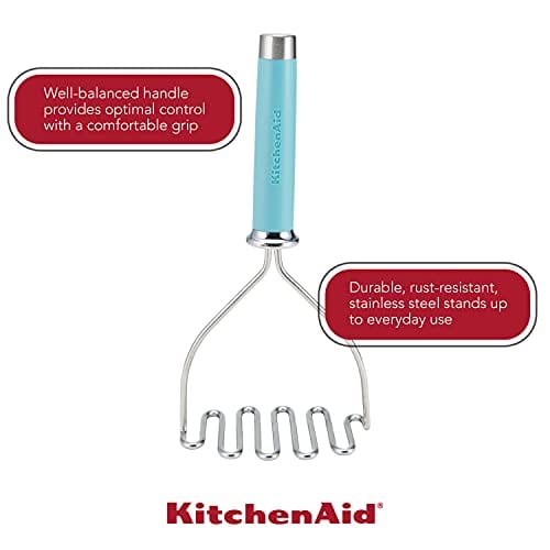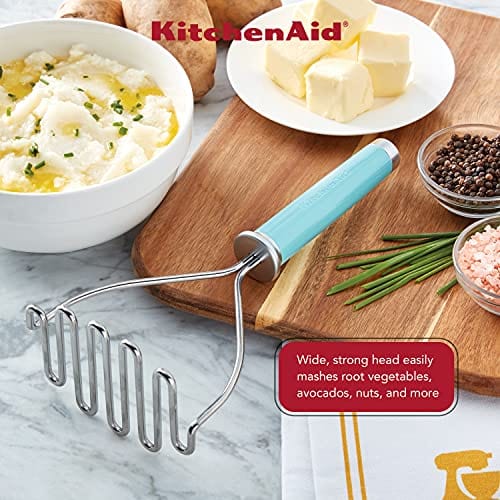 Details: The KitchenAid wire masher is essential for smooth mashed potatoes, vegetables, or fruit. The head is crafted from thick, 4. 5mm stainless steel wire which is durable and will not rust. The handle is well-balanced and ergonomically designed for Comfort and smooth operation under heavy use. An ABS chrome plated bolster, matte handle and a debossed logo are just some of the design elements that gives this masher an upscale look and feel. It also features a 1919 medallion on the stainless steel end cap, paying tribute to the year the KitchenAid brand was founded, and tying the tool in with KitchenAid electrics. Dishwasher safe for easy cleanup. One year hassle-free replacement and lifetime limited. One year hassle-free replacement and lifetime limited.