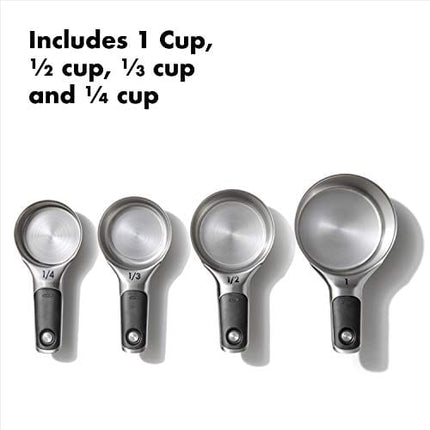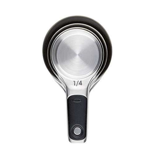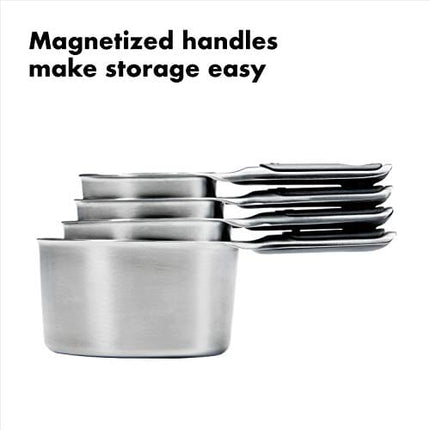 Details: The OXO Good Grips Stainless Steel Measuring Cup Set is an elegant yet functional measuring solution. The unique magnetic feature allows you to easily remove one Cup at a time. This feature also keeps the Cups neatly stacked together for storage. The sturdy, Stainless Steel Measuring Cups are designed to make leveling ingredients easy for greater accuracy. The Cups feature permanent, etched measurement markings and have soft, comfortable, non-slip handles. Set includes 1/4 Cup, 1/3 Cup, 1/2 Cup and 1 Cup Measuring Cups.