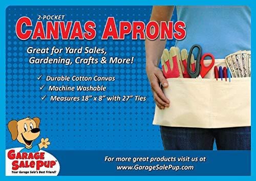 Details: These waist aprons are great for a variety of purposes. Use them to hold money at yard sales so your cash travels with you. No need for a cash box. Great for kids crafts. Each child can have one and decorate with markers, fabric paints, etc. Or use these aprons while gardening, for tools, in construction or teachers in the classroom. Made from 100% Cotton Canvas, these aprons are machine washable, are reinforced at major joints and have extra long 27" ties. With the convenient multi-pack, you always have another apron while one is in the wash.To Our Customers:Due to the extreme popularity of our aprons, other companies in the past offered their lesser quality aprons with logos on them under this listing. These companies have been removed. Please be assured that Aprons sold by Garage Sale Pup and Fulfilled by Amazon are of top quality and exactly as shown in this listing.Thank you,Garage Sale Pup