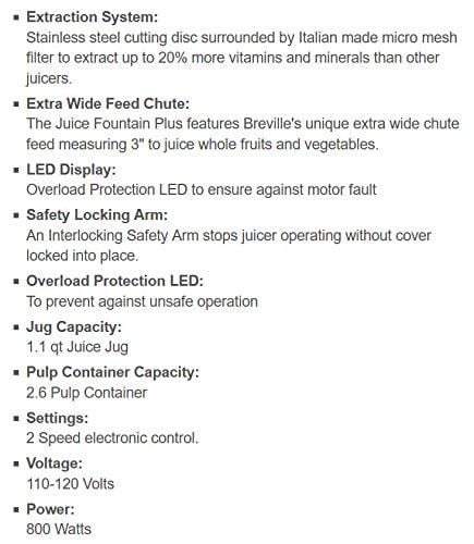 Details: The Breville JE98XL's dual Speeds allow you to juice both hard and soft fruits and vegetables Get into the world of juicing with this no-nonsense dual-Speed juice fountain. Ideal for first-time juicers, this juicer runs on 850 watts and has two Speeds, 12,000RPM or 6,500RPM, for hard and soft ingredients. High quality juicing, entry-level price Fruit is largely composed of water, but its selling point is its nutritional value. How do you extract the juice from fruit, without leaving the nutrients behind? Breville’s Nutri Disc and patented juicing system extract more nutrients than other juicers and transfers less than 1.8F of heat to protect enzymes and maximize nutrient absorption of select nutrients. The dual Speed, 850 watt motor allows you to juice hard fruits and vegetables like apples and beets on high Speed at 12,000 RPM, while the low Speed (6,500rpm) is optimal for softer fruits and leafy Green vegetables like cantaloupe and spinach. The Juice Fountain Plus cutting disc is so powerful that pineapple can be juiced in large chunks with the rind on. In addition, this juicer features an extra-wide 3-inch feeder chute that accommodates large chunks or entire pieces of fruit or vegetables, eliminating the need for chopping vegetables. The JE98XL is not only easy to use, but also easy to clean. It is pulp-ejecting and comes with a large-capacity pulp collector and most parts can be cleaned on the top shelf of the dishwasher. The extra wide 3" feed chute makes pre-chopping most fruits and vegetables unnecessary Product features: Heavy-duty 850 watt motor with dual Speed control: a low Speed (6,500rpm) for softer fruits and vegetables and a high Speed (12,000rpm) for harder fruits and vegetables Patented extra-wide feed chute (3” wide): juice large fruits and vegetables with little to no cutting or preparation Patented direct central feed system for maximum juice extraction Nutri Disc with stainless steel blades and stainless steel mesh filter basket for spinning out the pulp Heavy grade polymer body for durability 1 liter juice jug (34 fl. oz.) with froth separator Large capacity pulp container with integrated handle Cord storage: the power cord wraps around feet and clips into position under the base for a reduced counter-top footprint Safety Locking Arm prevents the juicer from operating without the cover locked into place Overload protection prevents over-heating, automatically shutting the machine down when it senses that the machine is overloaded All materials that come in contact with food are BPA-free, ensuring safe use Easy clean-up with the included cleaning brush. All parts except for the mesh filter basket/Nutri Disc and food pusher can be washed on the top shelf of the dishwasher. Model BJE820XL: Juice Fountain Duo 800JEXL: Juice Fountain Elite BJE510XL: Juice Fountain Multi-Speed BJS600XL: Juice Fountain Crush JE98XL: Juice Fountain Plus BJE200XL: Juice Fountain Compact Key Feature Die-cast juicer with soft fruit attachment and variable Speed capability 'Rolls Royce' of Juicers: die-cast metal matched with power Variable Speeds maximize yield across variety of fruits Makes thicker juices and yields more juice for leafy Greens and wheatgrass than non-masticating juicers Great entry price point for Breville juicers Compact design takes up less space, with all of the juicing capabilities of the other juicers Type of Juicer Centrifugal Centrifugal Centrifugal Masticating/slow juicer Centrifugal Centrifugal Motor 1200 watt 1000 watt 900 watt 240 watt 850 watt 700 watt Speed 5 Speeds ranging from 6,500rpm to 13,000rpm Low Speed of 6,500rpm, high Speed of 13,000rpm 5 Speeds ranging from 6,500rpm to 12,500rpm 80rpm Low Speed of 6,500rpm, high Speed of 12,000rpm 14,000rpm Materials Heavy grade die-cast metal body Titanium cutting disc Stainless steel micromesh filter Stainless steel puree disc Heavy grade die-cast metal body Titanium cutting disc Stainless steel cutting disc