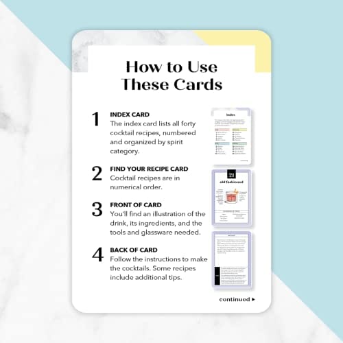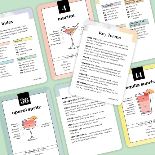 Sharpen your skills—Find cards that cover the basics of tending bar, key terms and tools, and essential mixing techniques. Choose your booze—Pick a drink that suits the mood with cards organized by spirit type: gin, rum, tequila, vodka, whiskey, brandy, Champagne and sparkling wines, and liqueurs and aperitifs. Keep it simple—Explore delicious recipes that don’t require a long list of barware or ingredients. Serve up a smash-hit gift—These cards make a terrific gift for the cocktail lover in your life, for birthdays, holidays, Father's Day, Mother's Day, or any occasion!