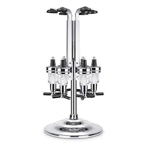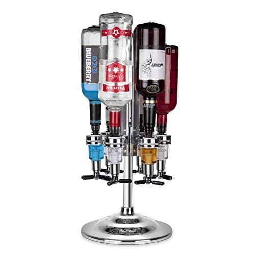 Details: Hold and dispense your favorite liquors from the Final Touch bar caddy dispenser. Made from a sturdy aluminum with a sturdy base, it holds up to six different bottles with up to one liter each. Push and pour perfect 1.5 ounce shots from the leak-proof spring-loaded dispenser, and simply wipe clean to keep the mirror finish looking great. Great for home use, as well as in bars and restaurants, this liquor dispenser is a fun and stylish way to keep the drinks coming. 9-3/4" diameter x 14" H