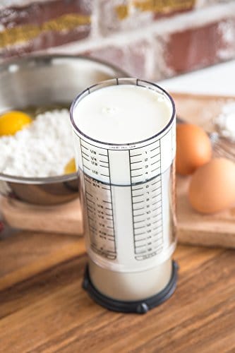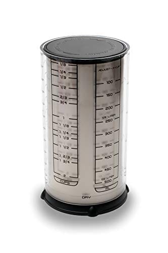 Details: Are your kitchen drawers being taken over by different sizes of measuring cups? Declutter and free up storage with the Pro 2 Cup Adjust-A-Cup. This adjustable measuring cup measures metric or standard for liquids, dry and semi-solid ingredients, like honey, peanut butter, shortening, and butter. Its convenient pint, cup, ounce, and millimeter markings make doubling and conversions a breeze. To use, simply pull the plunger down to the measurement indicated and add your ingredient. Constructed of durable ABS and SAN plastic and silicone, this unique measuring tool features an award winning design with patented features and comes in a beautiful champagne satin finish. For best results, hand wash the Adjust-A-Cup with a sponge and warm soapy water. Stop juggling multiple sizes of measuring utensils, reduce your collection, and witness the space-saving functionality of this useful, yet elegant tool.