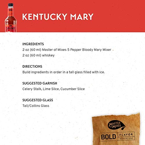 Includes a 6-pack of 1 liter (33.8 fl oz.) bottles of Master of Mixes 5 Pepper Extra Spicy Bloody Mary Drink Mix.