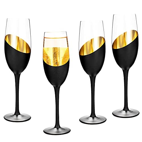- Set of 4 decorative modern black and gold toned champagne flute glasses with tilted design, great for toasting, New Years Eve, anniversaries, and other celebrations and special occasions