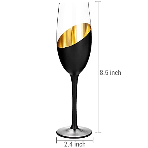 Details: Add a touch of sleek style and sophistication to any drinking occasion with these modern black and gold plated champagne flute glasses. Their lustrous combination of black and gold creates a fascinating display of light with champagne, wine, and other liquids, and make an excellent addition to any party, wedding, engagement, anniversary, New Year's Eve celebration, or any other special occasion.