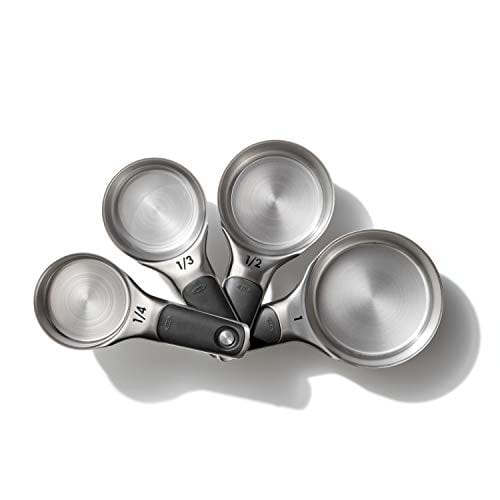 Details: The OXO Good Grips Stainless Steel Measuring Cup Set is an elegant yet functional measuring solution. The unique magnetic feature allows you to easily remove one Cup at a time. This feature also keeps the Cups neatly stacked together for storage. The sturdy, Stainless Steel Measuring Cups are designed to make leveling ingredients easy for greater accuracy. The Cups feature permanent, etched measurement markings and have soft, comfortable, non-slip handles. Set includes 1/4 Cup, 1/3 Cup, 1/2 Cup and 1 Cup Measuring Cups.