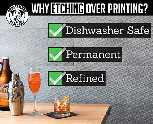 Details: Item Specs Height: 3.5 inches Top Diameter: 3.25 inches Bottom Diameter: 3.13 inches Capacity: 11 ounces Celebrate in style with this classic whiskey glass for the bourbon, scotch or cocktail lover in your life! 11oz capacity is perfect for everything from a night cap to an old fashioned. Permanent engraving cuts into the glass and creates a design to be enjoyed for years to come. This whiskey glass is a classic addition to any collection or bar. This restaurant quality, durable glass is dishwasher safe and great for regular daily use with water, soft drinks, or as a rocks glass. Designed and etched in Fayetteville, Arkansas on glassware that is made in the USA. Rest assured your gift will be classy, sturdy, and handmade to last a lifetime. Endless Enjoyment! - Makes a perfect birthday gift or party favor - A wonderful keepsake for any special occasion or anniversary - A unique personalized gift for a son, brother, or father - Backside optional text | Share your own message on the back of the glass for an additional charge (click Customize Now for options)