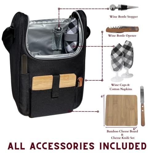 - ALL ACCESSORIES INCLUDED: All pictured accessories included. Each accessory has a special place to be packed away for easy storage and travel. Just add your favorite wine and cheese and off you go!