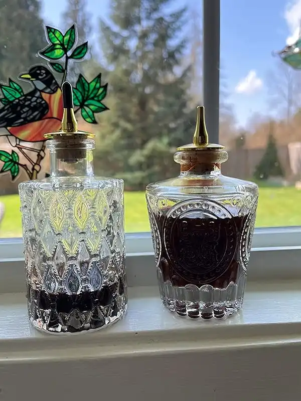 - ELEGENT SHAPE - 2 Classic bitters bottle with gold zinc alloy dasher top, professional great for bartender home bar. Also be the vintage clear decorative bottles, perfect for displaying flowers, essential oil reeds, or for table centerpieces at a wedding.