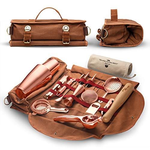 Travel Bartender Kit Bag | Professional 17-piece Copper Bar Tool Set with Stylish Portable Bar Bag and Shoulder Strap for Easy Carry and Storage | Best Rose Gold Travel Bar Set for Cocktail Making