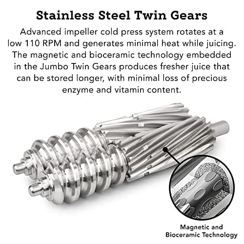 - PRODUCES FRESHER JUICE: Magnetic and bioceramic technology embedded in the Jumbo Twin Gears extracts nutrient-dense juice that can be stored longer. Pocket recesses and cutting positions aid in grinding and juice extraction