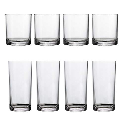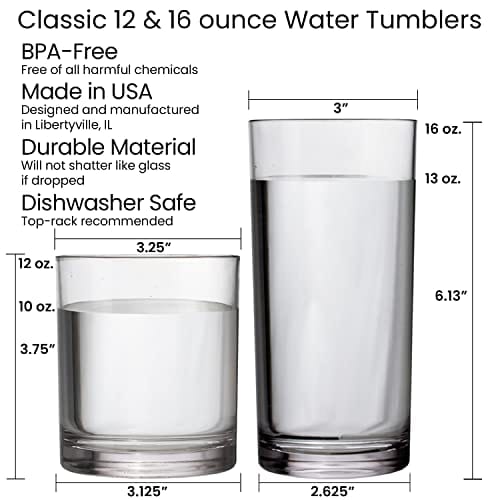 Details: Set consists of 8 break-resistant restaurant quality plastic tumblers - four 12-ounce tumblers and four 16-ounce tumblers. These sleek crystal-clear tumblers will match any place setting or table decor. Perfect for everyday use but are also elegant on a more formally set table. Great for patio, poolside, and other outdoor use! A safe and shatterproof drinking cup for children. These tumblers are top rack dishwasher safe, BPA-free, and made in USA by US Acrylic - a leading manufacturer of the finest quality products since 1978. Also available from US Acrylic for individual purchase from the Classic Collection are the Set of 6 | Classic 9-ounce Tumblers in Clear, Set of 6 | Classic 12-ounce Tumblers in Clear, Set of 6 | Classic 16-ounce Tumblers in Clear, Set of 6 | Classic 24-ounce Tumblers in Clear
